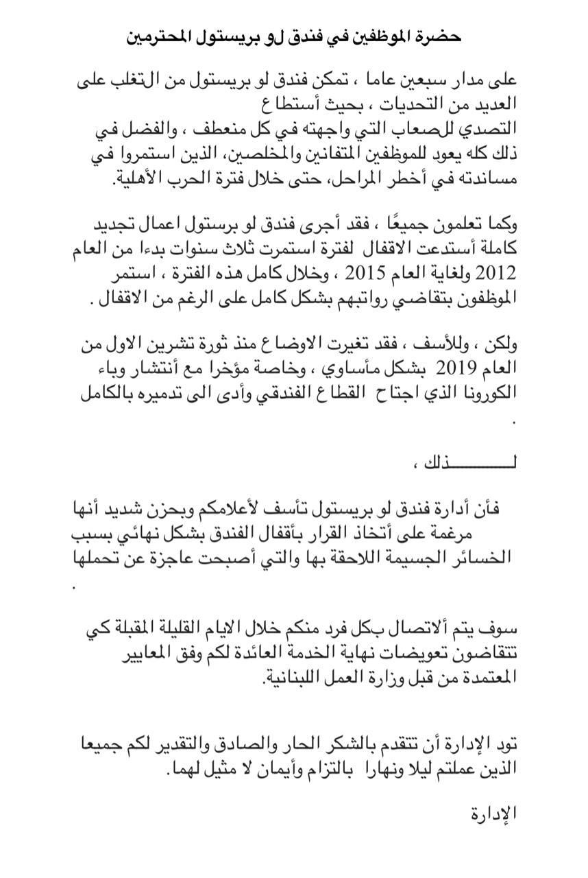 يتم التداول ببيان منسوب إلى إدارة فندق "البريستول" في بيروت، وفيه أنّ الإدارة تعلم الموظفين أنّها تتجه لإغلاق الفندق بشكل نهائي بسبب الخسائر الجسيمة التي أصبحت عاجزة عن تحمّلها. وتوجّهت إليهم بالشكر، مشيرةً إلى أنّها ستبادر إلى الإتصال بهم في الأيّام القليلة المقبلة لتقاضي تعويضات نهاية الخدمة وفق المعايير المعتمدة من قبل وزارة العمل. وتجدر ألإشارة إلى أنّ البيان لا يحمل أيّ توقيع. التفاصيل في الوثيقة المرفقة.