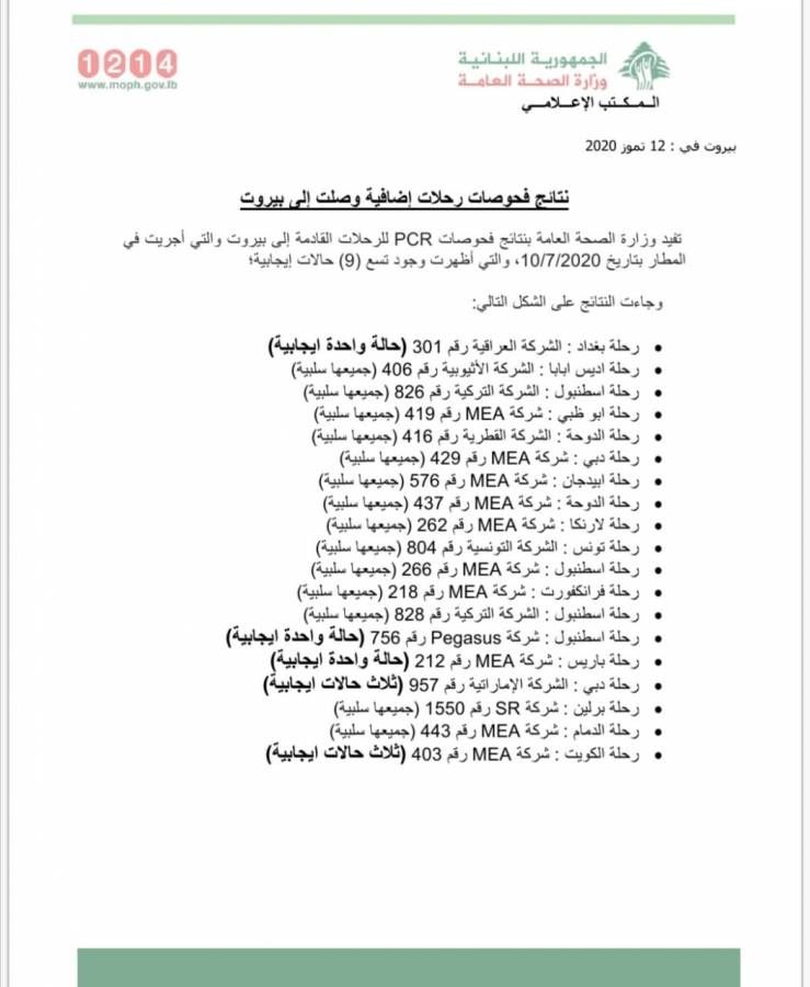 الارشيف / Top 10 / لبنان 24 إصابات بـ"كورونا" ضمن الرحلات الوافدة إلى بيروت يوم 10 تموز.. إليكم التفاصيل #lebanon24 via @Lebanon24 0 نشر إنشر فى Twitter إنشر فى Facebook إنشر فى Google+ أنشر فى Linkedin Pin this Post Share on Tumblr إنشرها فى اماكن أخرى Sunday 12th July 2020 02:48 PM 0 1/2 2/2 أعلنت وزارة الصحة العامّة، اليوم الأحد، عن وجود 9 حالات إيجابية في الرحلات القادمة إلى بيروت أمس الأوّل، يوم 10 تموز الجاري. التفاصيل في الصورة المرفقة: اشترك فى النشرة البريدية لتحصل على اهم الاخبار بمجرد نشرها تابعنا على مواقع التواصل الاجتماعى